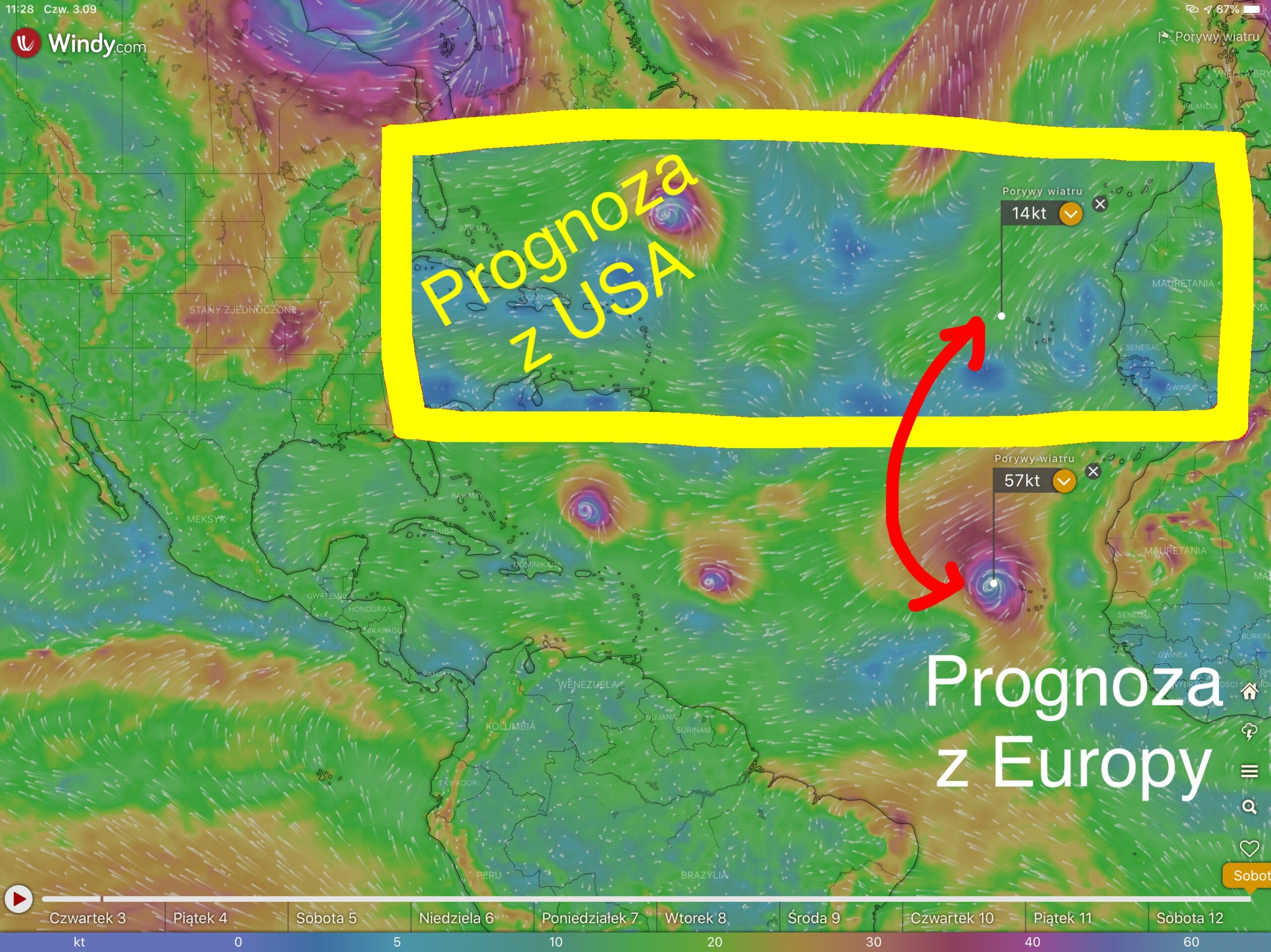 Śmieszy nas to i przeraża z perspektywy jachties zakotwiczonych za którąś z karaibskich wysepek. Po pierwsze obserwowanie modeli pogodowych to nasz chleb powszedni i wiemy, że rozstrzał w prognozach jest tak duży, że czasem nawet gdy sztorm już jest nad nami, na niektórych mapach w ogóle go nie widać. Po drugie prognozy to prognozy i pokazują uśrednioną wartość, czyli wiatr, który wieje z daną siłą przez określony czas, a my musimy reagować na strzały spod chmury, na komórki burzowe, których nie widać aż do momentu, gdy zaświecą na radarze. Po trzecie zasięg huraganu i wiatrów huraganowych jest nieduży, ale stan morza i burze utrzymują się w jego kilwaterze dość długo. Żeglowanie przez uciekanie po oceanie jest co najmniej idiotyczne, zważywszy na zmiany kierunku wiatru i dzikie fale wynikające z bałaganu. Pomijam absolutnie fakt, że kilka dni temu potwierdzono wreszcie zjawisko La Niña* na Pacyfiku, oraz to, że w tym roku sztormy chodzą parami a ostatnio nawet trójkami.